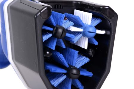 Teat Sanicleanse turi 3 šepetėlius: 2 šoniniai valymo metu sukasi ratu, masažuodami ir nuvalydami spenio šonus su šiltu vandeniu ir sanitariniu skysčiu. Trečiasis (didžiausias) šepetėlis tokiu pat būdu nuvalo spenio apačią.